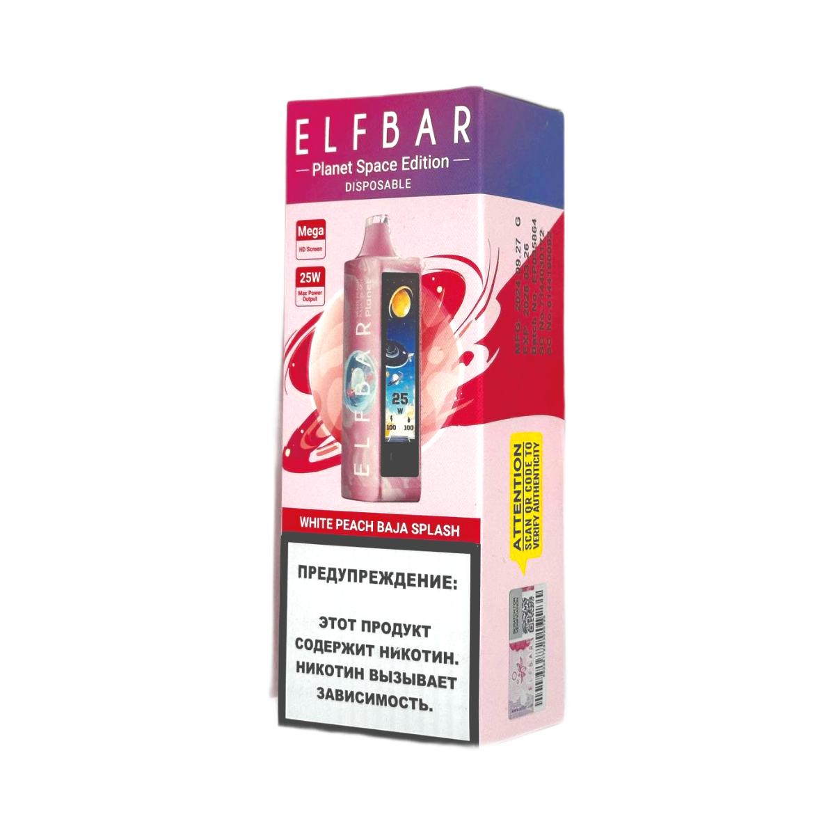 Электронная сигарета – это не просто никотиновое устройство, а стильный аксессуар, который подчеркивает современный образ жизни. ELFBAR 25000 PLANET станет отличным дополнением к вашему индивидуальному стилю и поможет насладиться неповторимым вкусом Белый персик Байя Сплеш.