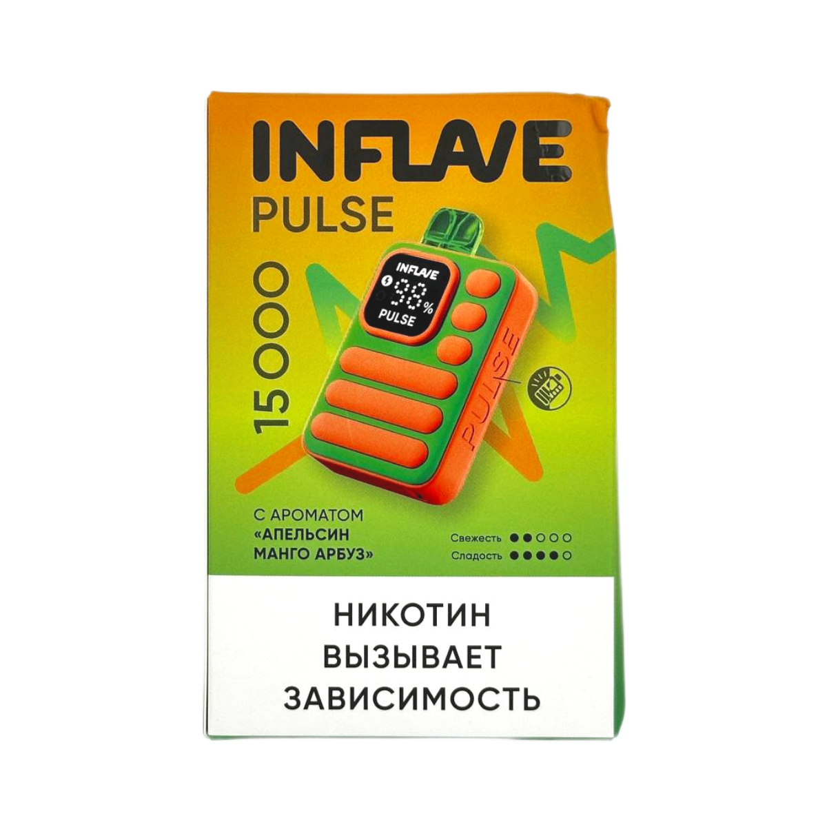 Электронная сигарета INFLAVE PULSE 15000 Апельсин манго арбуз – это современное устройство для парения с ярким и насыщенным вкусовым профилем. Данная модель представляет собой высокотехнологичный гаджет, разработанный с учетом последних тенденций в области электронных систем доставки никотина.